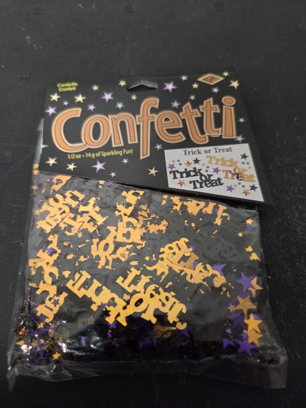 .5 Ounce Trick or Treat Confetti. Trick or Treat in Black and Orange with Black, Orange and Purple Stars.