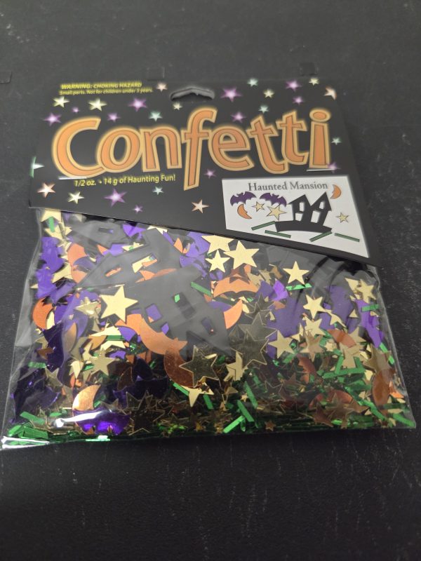 .5 Ounce Haunted Mansion Confetti with Purple Bats, Orange Moons, Gold Stars, Black Mansion and Green Grass.