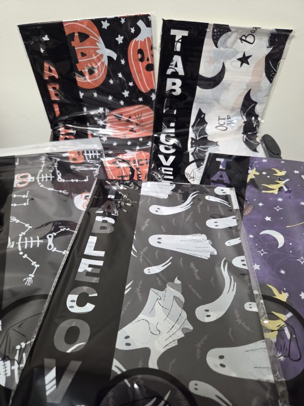 54″ x 108″ Table Cover. 5 Different Prints. Black with Orange Pumpkins, Black with White Ghosts, Black with White Skeletons, White with Black Bats, and Purple with Cauldrons and Spell Books