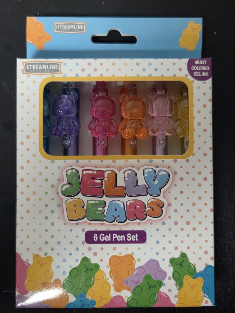 Jelly Bears Gel Pen Set. 6 Color Gel Pens: Teal, Purple, Hot Pink, Orange, Pink and Yellow.