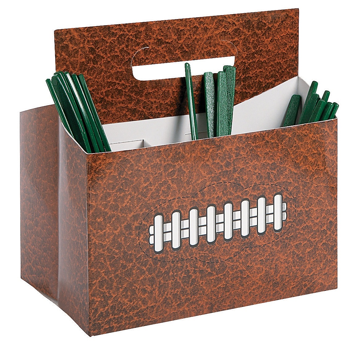 Paper Cardstock Football Utensil Caddy. Approximately 7 3/4″ X 5 1/4″ X 8″. Simple Assembly Required.